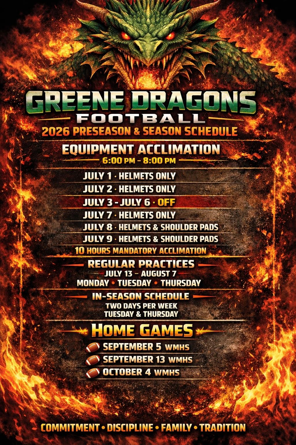 This is a tenative schedulle for Greene Dragons Football leading up Game #1 8/29 or 8/30